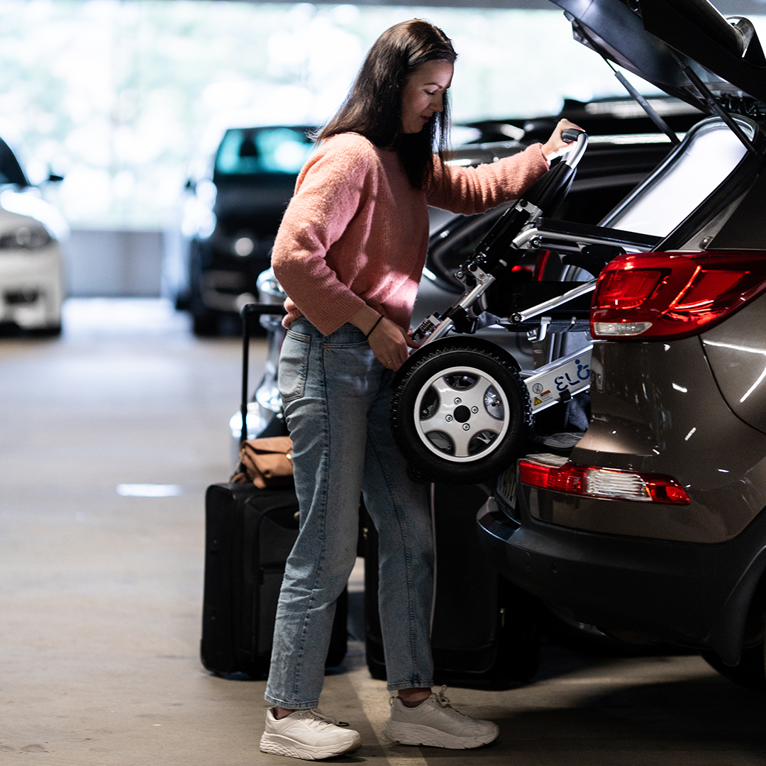 Eloflex is a completely new generation of foldable power wheelchairs with a host of unique features. The modern design lets you fold it, one-handed, into a compact size for handy storage at home or in a car. It takes up little space, and the exceptionally low weight makes it easy to take with you. With Eloflex, you reclaim your freedom – a feeling you can take with you anywhere.