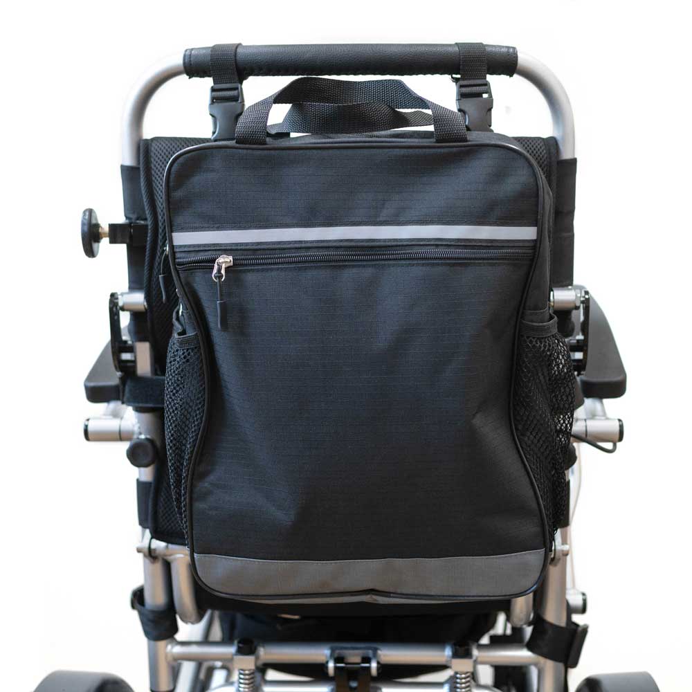 Experience the perfect blend of spaciousness and durability with our Backrest Bag, designed to fit perfectly with all Eloflex models. This versatile bag is mounted with straps around the backrest of the electric wheelchair and then effortlessly removed or put back on with quick-release buckles and VELCRO® straps. In addition to the large main compartment, the bag has a spacious front pocket and handy mesh side pockets, offering plenty of storage options for your belongings. The Backrest Bag is equipped with reflective tape for increased safety. It accomodates16 L and is 39 cm high, 37 cm wide and 12 cm deep.